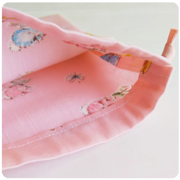 今回は、両ひもの巾着袋を作りますが、片ひもにする場合は、片側にのみあき口を作り、もう片側は上端から下まで縫ってしまいます。