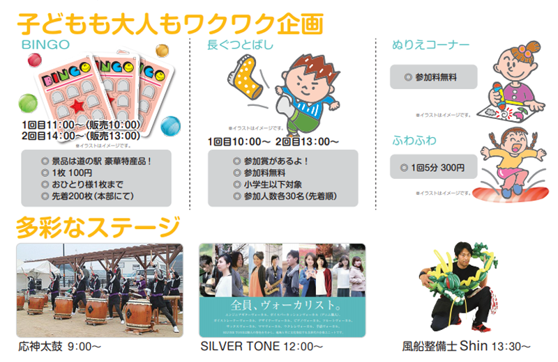 イベント内容は、ビンゴ大会や長ぐつとばし、ちびっこコーナーなど。
